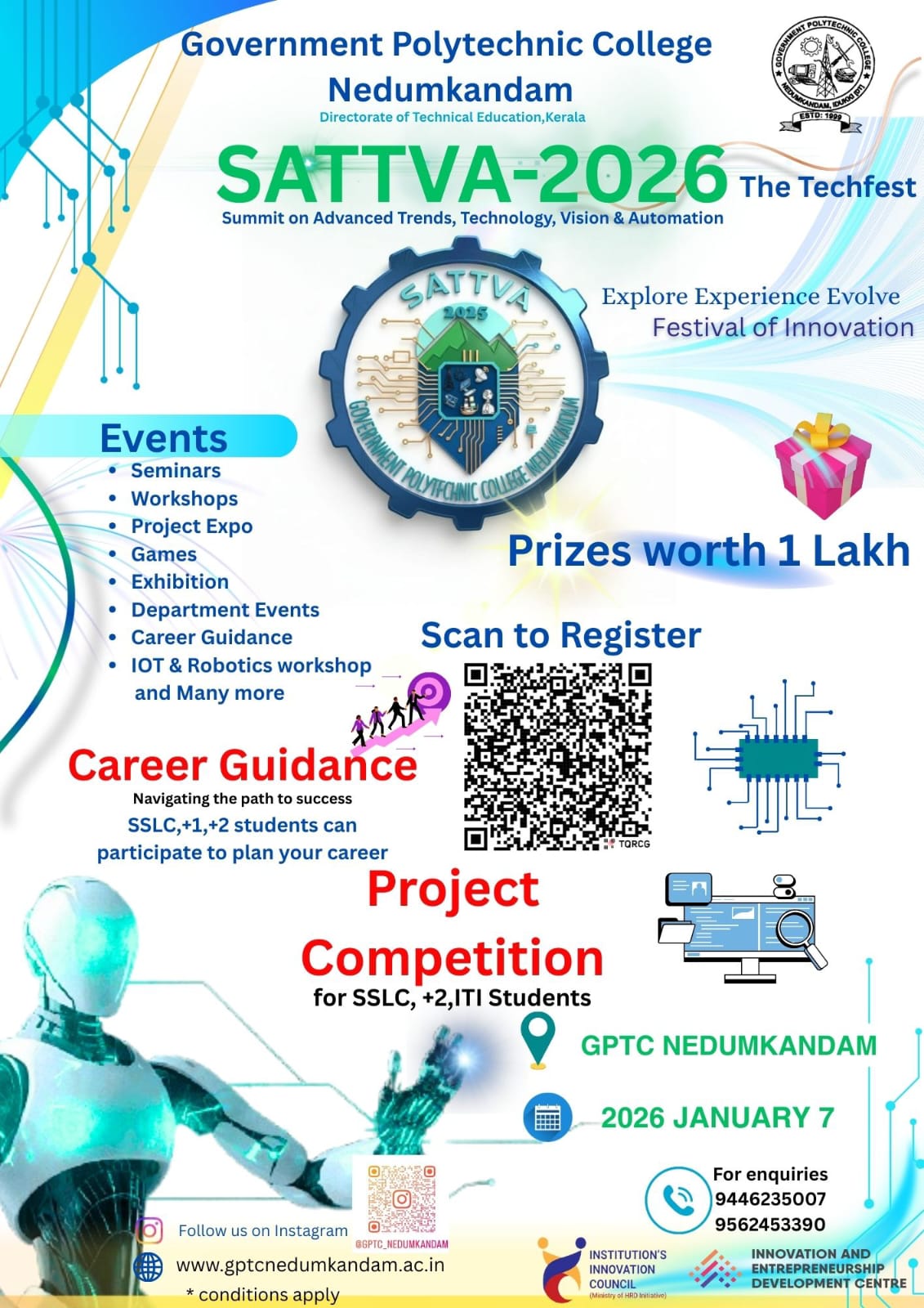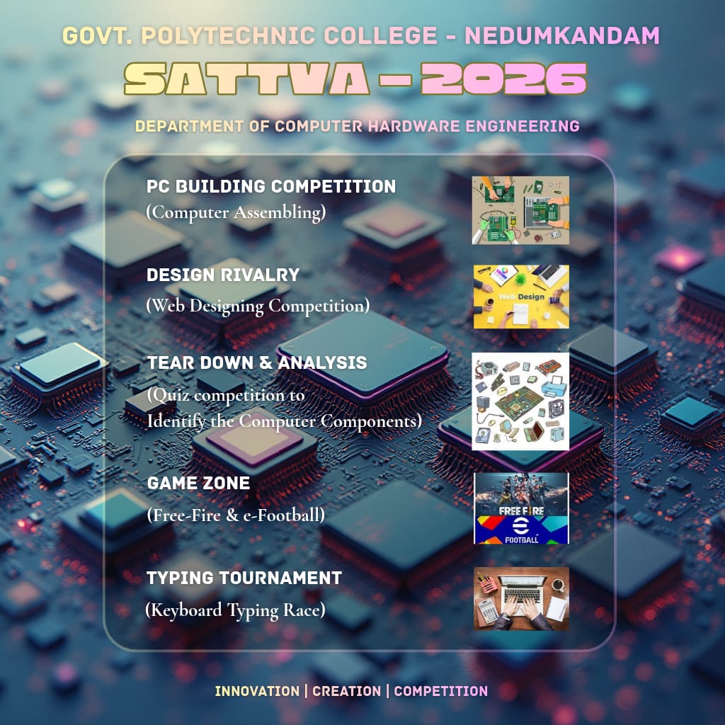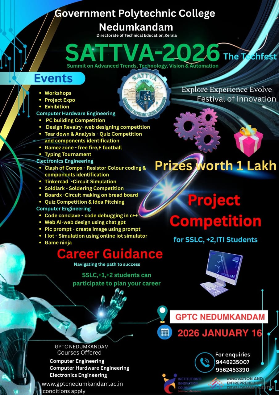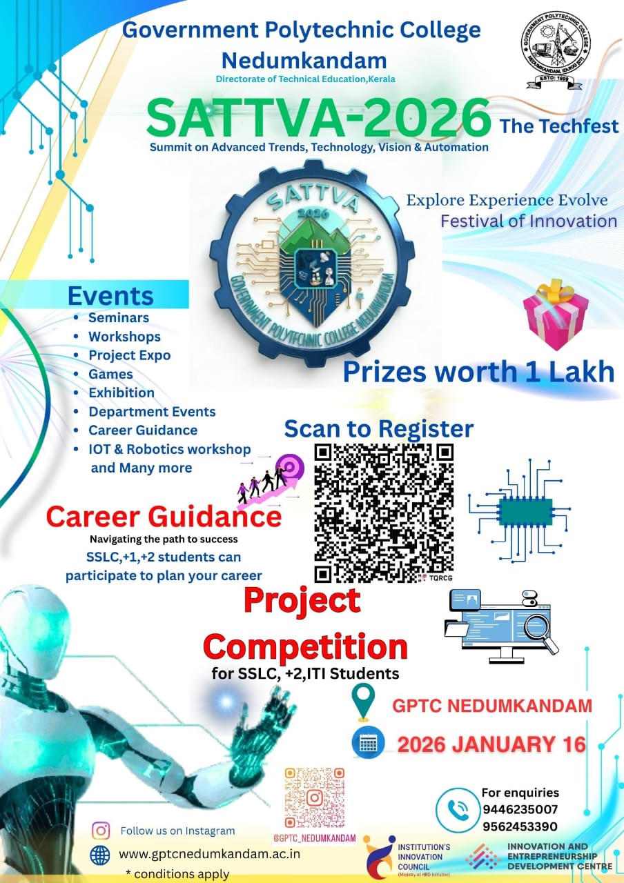 Government Polytechnic College, Nedumkandam, established in 1999, is dedicated to providing quality technical education and skill development to the rural youth of Idukki. With committed faculty, modern facilities, and a supportive learning environment, the college aims to mould competent, disciplined, and socially responsible technologists. We continue...